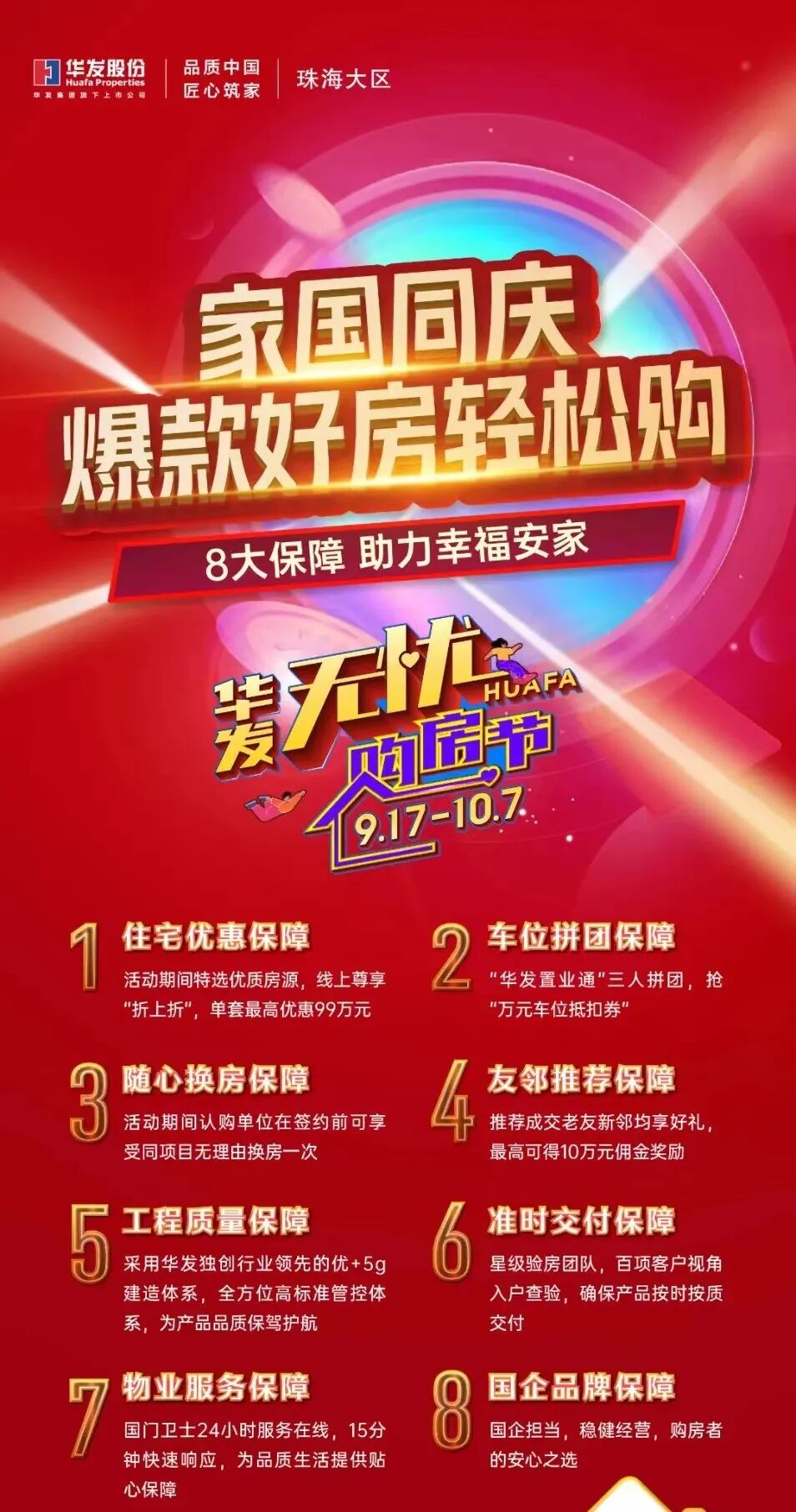 丨销售中心现场 你准备好拼手速了吗? 一方面,从整个行业的政策环境、金融筑底的情况来看,近期就是楼市一大转折期,把握机会出手是应有之义;另一方面,无论市场如何变化,坐拥地段、配套和稀缺资源的产品,始终是抢手货。 对了,为了让购房者能买得放心,华发股份真金白银送优惠,特推“华发无忧购房节”活动,推出精选品质好房、9.19元抢购1%购房优惠券、异地到访一站式报销机票等8大惊喜福利。(具体活动以现场咨询为准) 华发,从来都是诚意十足。