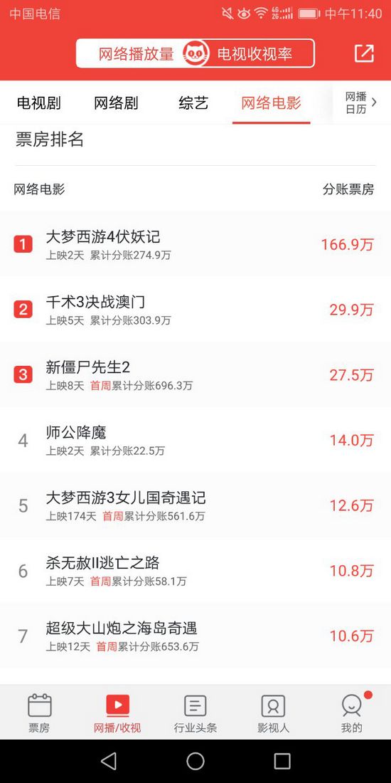 截止至1月13日晚8点,《大梦西游4伏妖记》点击量已超1500W,刷新了“大梦西游”系列电影点击量记录,连续2天占据爱奇艺电影热播榜榜首。影片在爱奇艺掀起一阵阵热浪的同时也带动了仍在分帐期的《大梦西游》和《大梦西游3女儿国奇遇记》,分列猫眼网络电影票房榜第一名、第五名以及第十名。