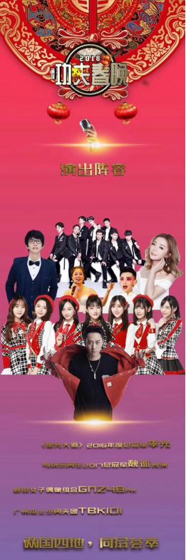 2018年全球功夫春晚是以功夫主题形式为主线,以世界各国有代表性的功夫竞技、功夫演艺、劲歌热舞等艺术表现形式,辅之以中国南北派功夫表演、岭南地区动静结合的民族、民俗、民间的文化表演内容,打造成中国红红火火过大年,快乐中国人、幸福中国人、健康中国人,欢欢喜喜过大年的吉祥氛围。同时,2018年全球功夫晚会将以中欧旅游年为契机,以功夫为载体和连结纽带,向全世界展示中国壮丽的地标性景点、地域文化以及民族、民俗、民间文化。 而在当晚,也就是2月8日,2018年全球功夫春晚正式开始,从节目名单和节目现场上可以看到,这次的春晚演出阵容非常强大,《星光大道》2016年度总冠军李光与快乐男生2017年总冠军魏巡同台竞演,同时有着著名女子团体SNH48姐妹团新锐女子偶像组合GNZ48和最近非常火热的广州本地少男天团TBK101的倾情加入。