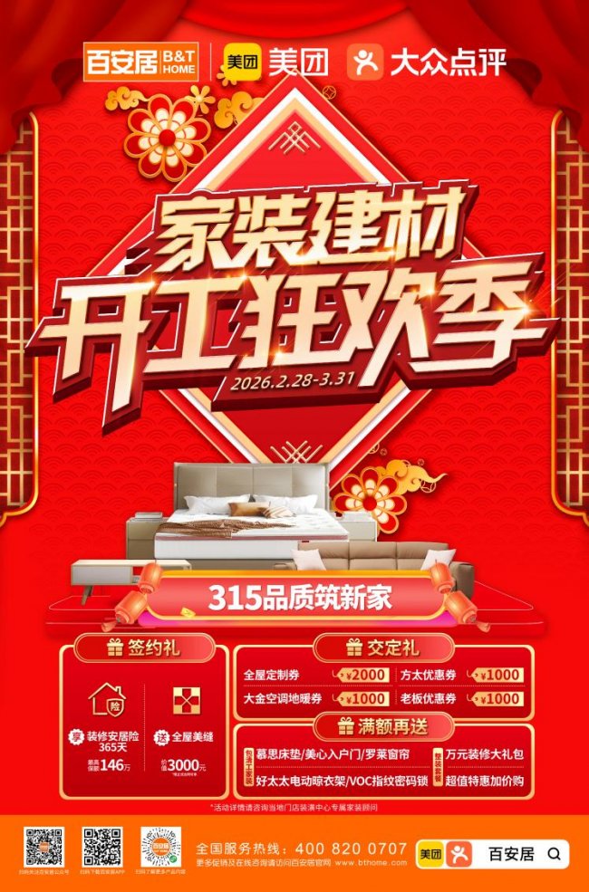 315品质筑新家 开工钜惠惊喜来袭 春日焕新,美好启幕,恰逢315消费品质提升的关键节点,百安居精准洞察春季家居焕新需求,以“315 品质筑新家”为主题开启家装建材开工狂欢季大促,将品牌一贯坚守的高品质产品与服务融入每处细节,以硬核的品质承诺为消费者保驾护航,推出层层递进的惊喜福利,让焕新之旅更省心、省钱。 活动期间,成功签约百安居家装套餐即可享专属签约礼,不仅能拥有365天装修安居险,为家装全程保驾护航;缴纳定金可解锁丰厚交定礼,可领取各品类超千元优惠券,家装核心品类优惠一站配齐,轻松降低装修成本。超值特惠加价购等福利,让消费者花更少的钱,实现家居的焕新升级,享受更优质的家装体验与品质生活。